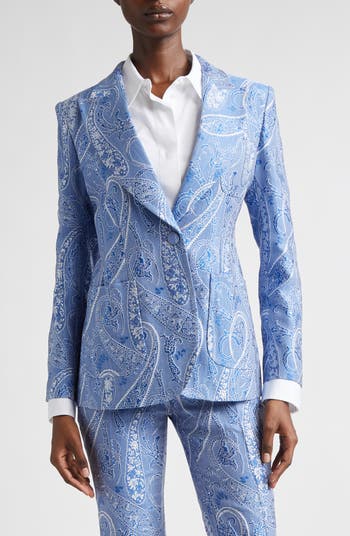 Ornate paisley embroidery illustrates and animates this microchecked one-button jacket tailored from silk-enhanced fabric.