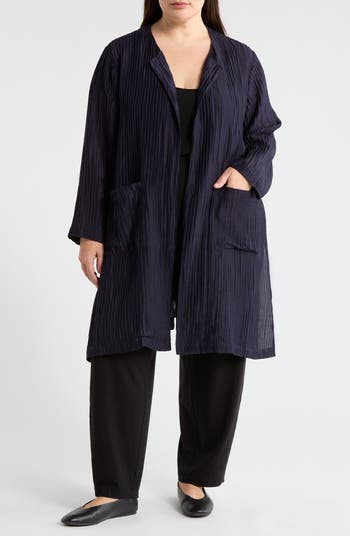A lightly lustrous jacket is textured in intricate vertical pleating for a look that works for fun and fancy.