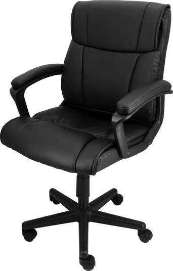 The Elama Mid Back Rolling Adjustable Faux Leather Office Chair in Black is the perfect blend of comfort, style, and functionality for any home or office workspace. Featuring a sleek black design with high-quality PU leather upholstery, this office chair is both durable and easy to maintain. The primary sponge cushion provides enhanced comfort, while the fixed padded armrests offer added support during extended periods of use. With an adjustable height feature and a Class 3 gas lift, you can easily customize the chair to your ideal sitting position. The butterfly mechanism ensures smooth and effortless adjustments, allowing for a personalized seating experience.