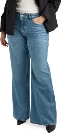 Made from faded nonstretch denim, these jeans feature a mid-rise waist and full-length flared legs to add drama to everyday outfits.