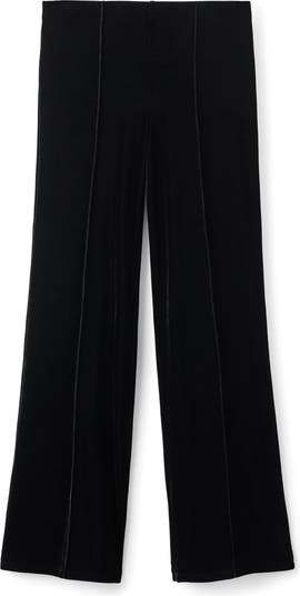 Velvet with a subtle sheen and a touch of stretch gives these pants a polished, after-dark appeal while the stitched-seam detail draws a clean line from waist to hem. The elastic waistband keeps the mid-rise fit comfortable, making the pants easy to pull on and go.