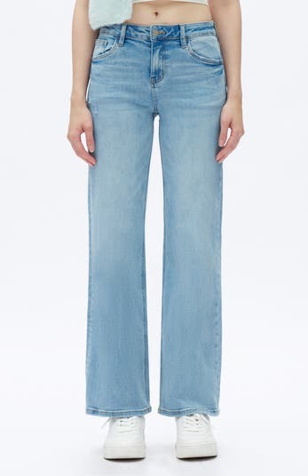 Wide but not too wide, these stretchy jeans feature a mid-rise waist, full-length legs and a versatile wash with hints of distressing.