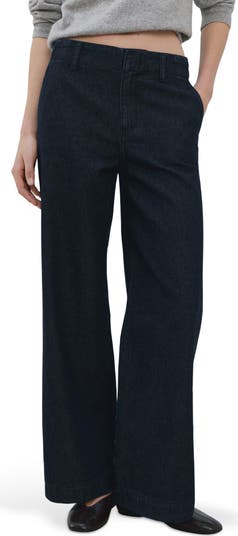 A refined way to wear denim, these trouser-style wide-leg jeans feature slanted front pockets, wide hems and a dark-indigo wash without any fading.