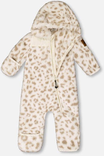 Detailed with foldover hand and feet covers, this mid-season outer layer is designed to keep baby safe and warm from head to toe. This plush one-piece is made from eco-friendly fabric made from recycled plastic bottles and features long sleeves, a cozy hood with animal ears on top, an asymmetrical zipper closure, and an allover animal print.