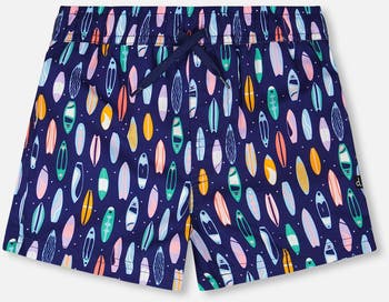 Our boardshorts in blue with surfboard print add a colorful touch to days by the water. These mid-thigh swim shorts feature a playful allover surfboard pattern in bright shades against a navy background, crafted from lightweight recycled polyester with a mesh lining for comfort. Finished with an elastic waist and adjustable drawstring, they are designed for easy movement and secure fit during all summer adventures.