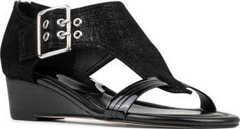 An oversized buckle shines at the side of a memory foam-cushioned sandal set on a low wedge.