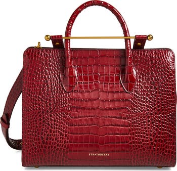Clean lines and rich croc-embossed texture amplify the understated elegance of a scaled-down leather satchel topped with the brand's distinctive bar closure. A rolled top handle and adjustable strap add carrying versatility to the polished look.