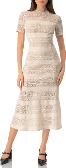 Crochet midi dress in natural color with Crew Neck and short sleeves.