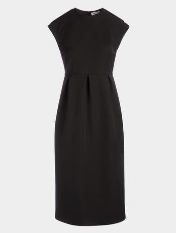 This midi dress in black gabardine is cut to an essential silhouette with cap sleeves and two hip pockets.