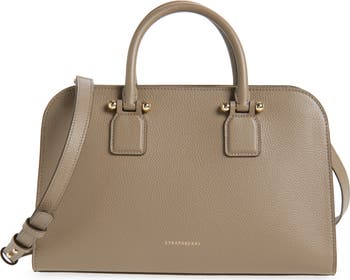 Strathberry's signature bar hardware authenticates a compact tote designed in a structured silhouette inspired by Edinburgh's historic Georgian architecture. A goldfoil logo glints against the pebbled leather of this handcrafted style.