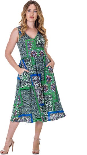 An effortless fusion of style and comfort, the 24seven Comfort Apparel Womens Midi Length Green Scarf Print Sleeveless Pleated Pocket Dress combines a chic V neck, functional pockets, and graceful pleats, finished off with a flattering fit and flare silhouette that suits any occasion. Crafted from a comfortable stretchy polyester blend, the dress is designed for all day wearability. Whether you prefer a relaxed look with sandals or opt for elevated sophistication with heels, the versatility of this dress makes it a wardrobe staple. The standout feature is the beautiful geometric green scarf print, adding a touch of uniqueness to your ensemble. Experience the perfect blend of easy to wear fashion and distinctive style with this midi length dress an essential addition for those who value both comfort and individuality in their wardrobe.