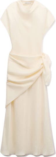 Luminous, drapey fabric brings elegant movement to this refined dress styled with a softly draped high cowl neckline and cap sleeves. The silhouette flows into a gently flared midi skirt, and a matching scarf offers versatile styling for a polished finish.