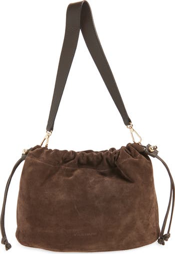Strathberry's signature bar hardware authenticates this supple suede bag designed in a dustbag-inspired silhouette equipped with a top handle and adjustable crossbody strap.
