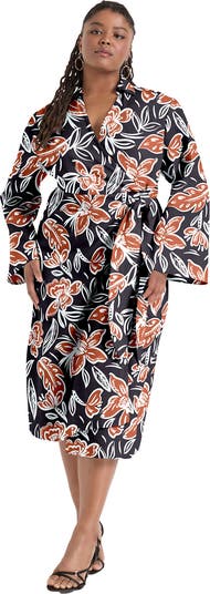 This midi-length wrap dress features a flattering surplice front, long flare sleeves, and a self-collar for a chic, breezy look. Made from a luxurious fabric blend, it's perfect for adding a touch of elegance to your casual wardrobe.