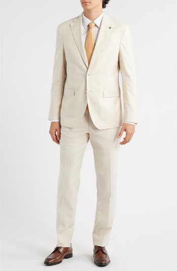 A subtly slubbed blend of wool, cotton and silk brings sunny-day versatility to a suit designed in a pale tan and tailored with an unconstructed fit for easy comfort. The flat-front trousers sit just above the hips and feature lightly tapered legs to keep the silhouette crisp and modern.