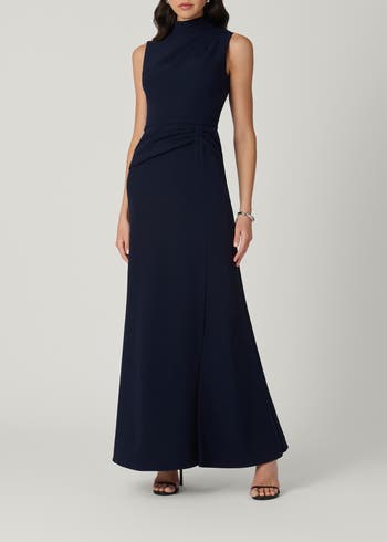 Timeless full-length gown made in our signature stretch crepe fabric. This dress features a draped pleating detail at the shoulder, and elegant ruching at the front waist. Mock neckline and slight mermaid shape skirt.