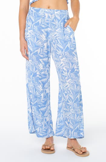 Full, wide legs bring movement and ease to these palm-patterned pants cut from a lightweight fabric for a feel-good fit.