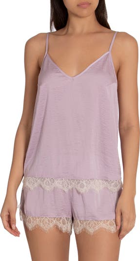 Hammered satin gently caresses the skin as you slumber in this pajama set featuring a swingy lace-trimmed camisole and coordinating shorts.