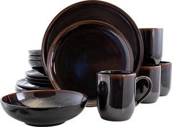 Elama Midnight Beach 16 Piece Round Stoneware Dinnerware Set was made with you in mind. The beautiful metallic plate set is both elegant and modern. Beautiful for special occasion settings and durable for everyday use. Constructed of Stoneware with a deep rich black tone, washed design and brown trim, this set is surly to make a statement. Each piece in this 4 person set is microwave and dishwasher safe, making is easy and convenient for for reheating and clean up.