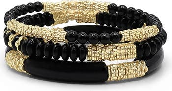 Classic and chic, this three-piece bracelet stack is a striking counterpart to our bestselling Clearwater Beach design. Featuring black beads with textured gold-plated accents, each bracelet is made with a unique pattern and bead size for dimension and depth. Wear them together for a statement look, or individually for a more minimal style. Handmade with a mix of glass and gold-plated textured beads. To preserve the finish, avoid water, lotions, perfumes, and harsh chemicals. Store in a dry place when not in use.