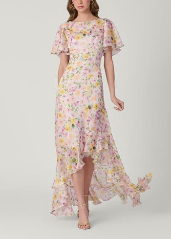This evening dress is made in a floral printed chiffon fabric. Its relaxed silhouette features a boat neckline, flutter sleeves, and a high/low asymmetric ruffle detail at the hem.