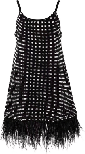 Step into the spotlight with the Midnight Crystal Feather Dress, a mesmerizing piece designed for the ultimate evening glamour. This chic dress is adorned with a sparkling array of midnight-black crystals, creating a dazzling effect that will catch every light in the room. The sleek, spaghetti-strap design offers a modern, sophisticated silhouette, while the hem is finished with luxurious black feathers, adding a touch of drama and flair to your look.