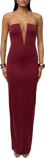 A deeply dipped neckline with a sheer mesh panel gives this curve-skimming strapless gown a flirty illusion element for added dramatic effect.