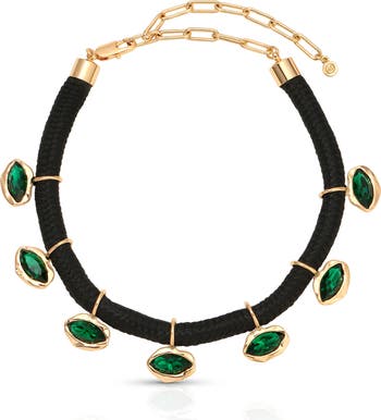Organic-inspired charms winking with faceted stones station this woven cord necklace for an earthy-meets-elegant look.