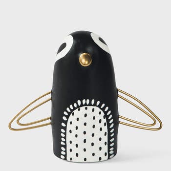 Playful yet poised, this papier-mâché penguin adds a touch of winter whimsy to the season. With golden wings and a snowy, patterned belly, its a delightful accent for festive mantels or childrens rooms.