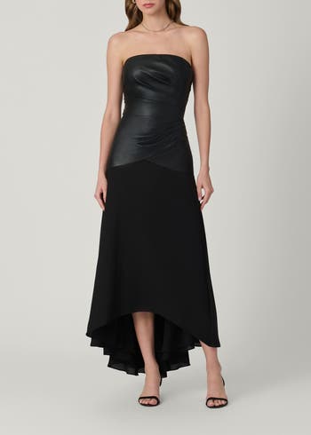 Beautiful evening dress made with a faux leather bodice and combo georgette skirt. The bodice features draped pleating for added interest, and the skirt has a subtle high low hemline. There is an interior bustier inside the bodice for added support.