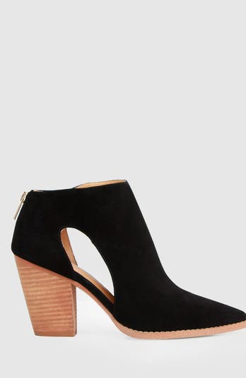 The edgy cutout silhouette of the Midnight Special Suede Ankle Boots by Belle & Bloom is balanced with a classic suede and wooden heel pairing.