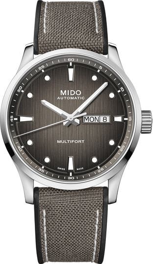 A sunray dial enriches this accurate Swiss-automatic watch styled with bar and dot markers and a large date window to achieve a retro look. It boasts an 80-hour power reserve and a skeletal caseback, while a fabric and rubber strap gives it sporty appeal.