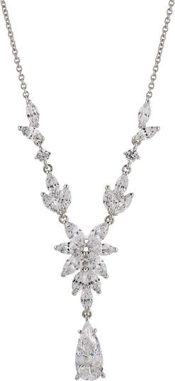 A delicate chain plated in gleaming rhodium blossoms with cubic zirconia flowers in this frontal necklace.