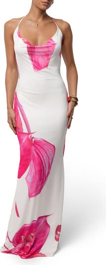 Romantic yet bold, this cocktail dress features a placement print that feels like a summer dream. The shimmering floral hardware at the strap is the perfect finishing touch for a look that’s effortlessly captivating.
