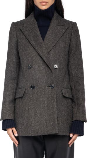 A herringbone pattern brings classic sophistication to this wool-rich blazer designed in a double-breasted silhouette.