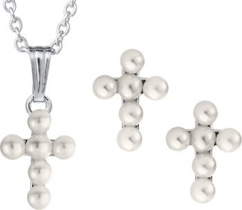 Lustrous cultured pearls shimmer on a sterling-silver cross necklace and earrings that she's sure to treasure for years to come.