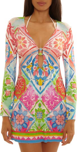 Light and breezy, this multifit cover-up tunic brings a pop of color to your next poolside hang with its eye-catching pattern and embellished ring.