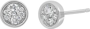 A twinkling total of 12 round diamonds sparkles from circle-shaped studs set in icy 18-karat white gold.