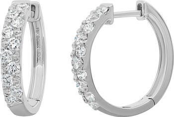 High-polished hoop earrings handcrafted in icy 18-karat white gold are illuminated by 20 round diamonds.
