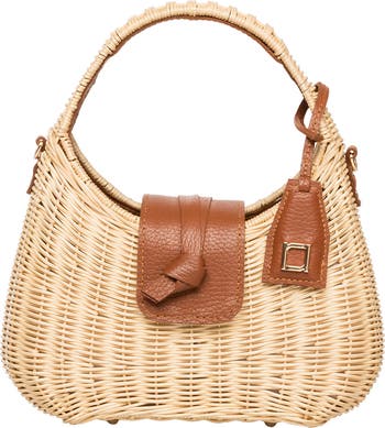 - Top handle wicker bag with cognac leather trim and shoulder strap