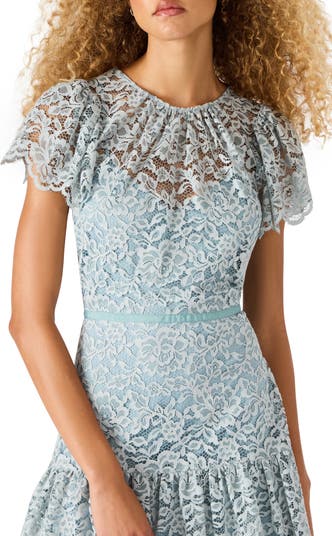 Fluttering sleeves and a frilled hem add graceful movement to this leggy-length dress made from intricate floral lace.