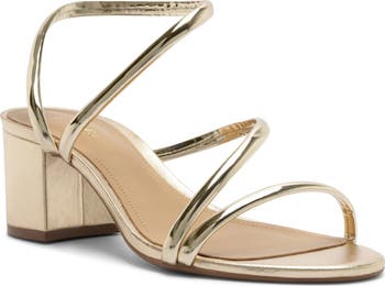 Tubular, asymmetric straps amplify the striking dimension on a Brazilian-made sandal shaped from metallic faux leather and lifted by a wrapped block heel.
