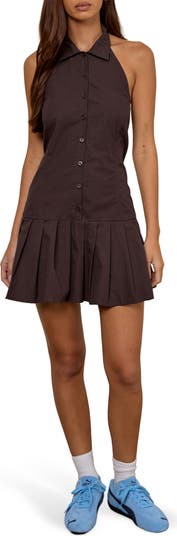 A polished poplin dress is updated in a leggy length and a skin-showing halter silhouette. Sharp pleats add swingy movement to its flared skirt.