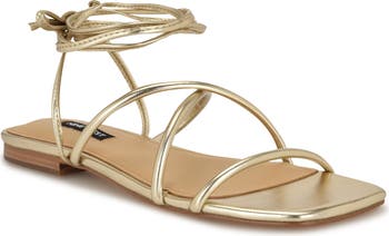 Tubular straps crisscross over the vamp of a sleek faux-leather sandal finished with slender ties the wrap around the ankle for a stylish and secure finish.