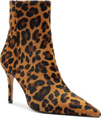 Make a striking statement in this leopard-spotted bootie fashioned from soft calf hair with a pointy toe and slender stiletto heel.
