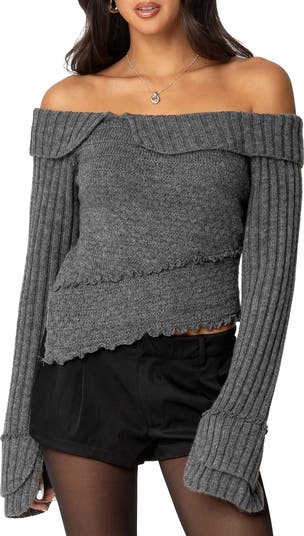 Equal parts cozy and chic, this shoulder-baring sweater is knit with textural ribbed and lettuce-edge stitches, layered split cuffs and an asymmetric hem.