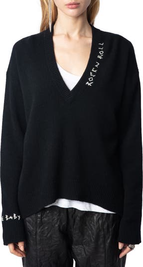 Edgy contrast stitching scrawls along the neckline and cuff of this cashmere sweater that effortlessly couples luxurious softness and punk-rock style.
