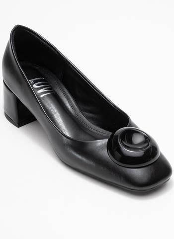An elegant silhouette featuring a square toe and signature rounded buckle detail for a refined, modern finish.
