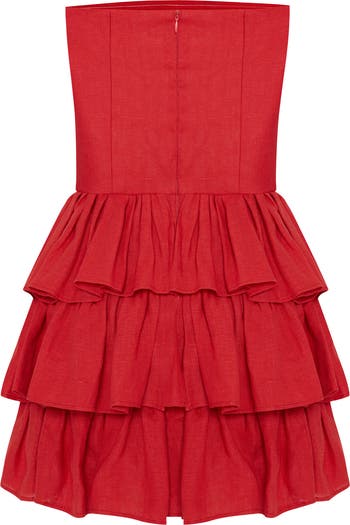 Make a statement this summer in the Mila Dress, the ultimate expression of femininity. Crafted with luxurious 100% linen fabric in an eye- catching goji red hue, this dress is sure to turn heads. Featuring a flattering strapless neckline and mini length, the Mila Dress drapes beautifully in ruffles, offering a breezy feel as you soak up the summer sun.