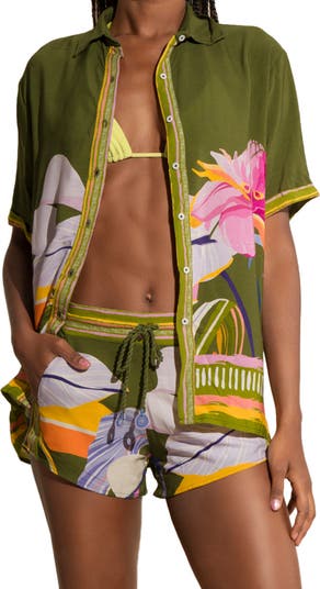 This cover-up shirt in a tropical pattern is ready for your next beach vacay.